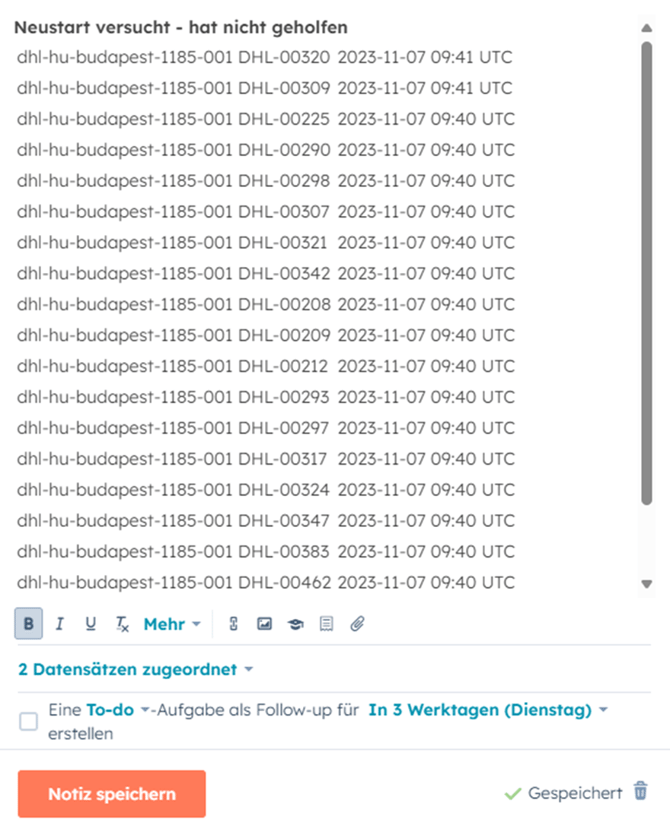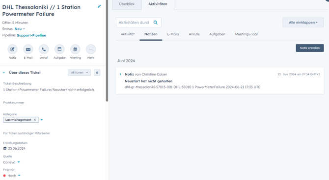 - Neues Ticket in Hubspot erstellen (siehe Schritt neues Ticket erstellen) sowie Notiz im Charge Alert Ticket erstellen. Notiz: Standort: neues Ticket xxxx (Bsp: dhl-tu-istanbul-34050-002: neues Ticket 2702003562